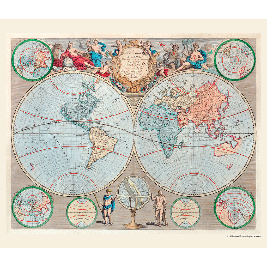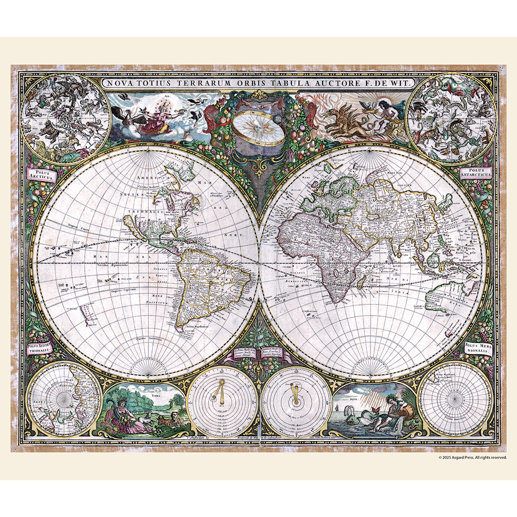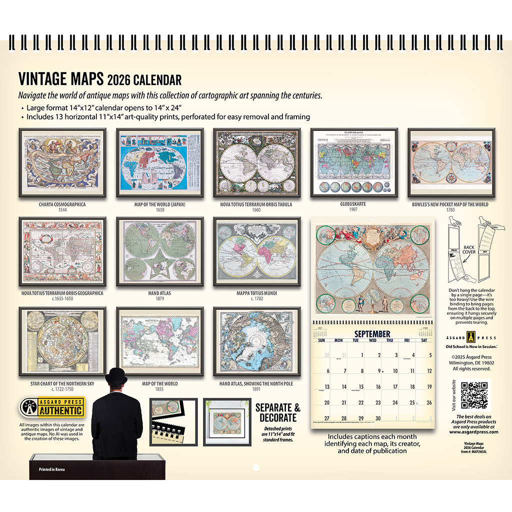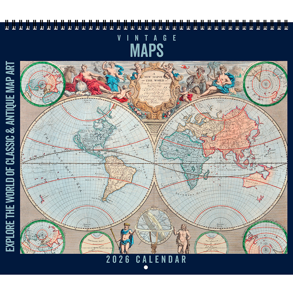 Navigate the world of vintage and antique maps with this annual collection of cartographic art spanning the centuries. Each month within the Asgard Press 2026 Vintage Maps Deluxe Wall Calendar brings you a full-color reproduction of a classic map from the 1500s to the 1900s. Informative captioning provides context for each image through information such as map title, year of creation, and artist or publisher. See the world as our forebearers did and explore the artwork that represented the knowledge of those times. With its large horizontal format of 14×12 inches, our wire-bound deluxe wall calendar opens to an impressive 14×24 inches. The perforated design allows for easy removal of each month’s image, making them an exact fit for standard 11×14 inch frames. Generously sized grid spaces leave plenty of room to keep track of all your appointments, reminders, and events. Appropriate for home, office, and even classroom, the Asgard Press 2026 Vintage Maps Deluxe Wall Calendar is ideal for the vintage enthusiast wishing to add a distinguished and worldly touch to their home while organizing their year in style.