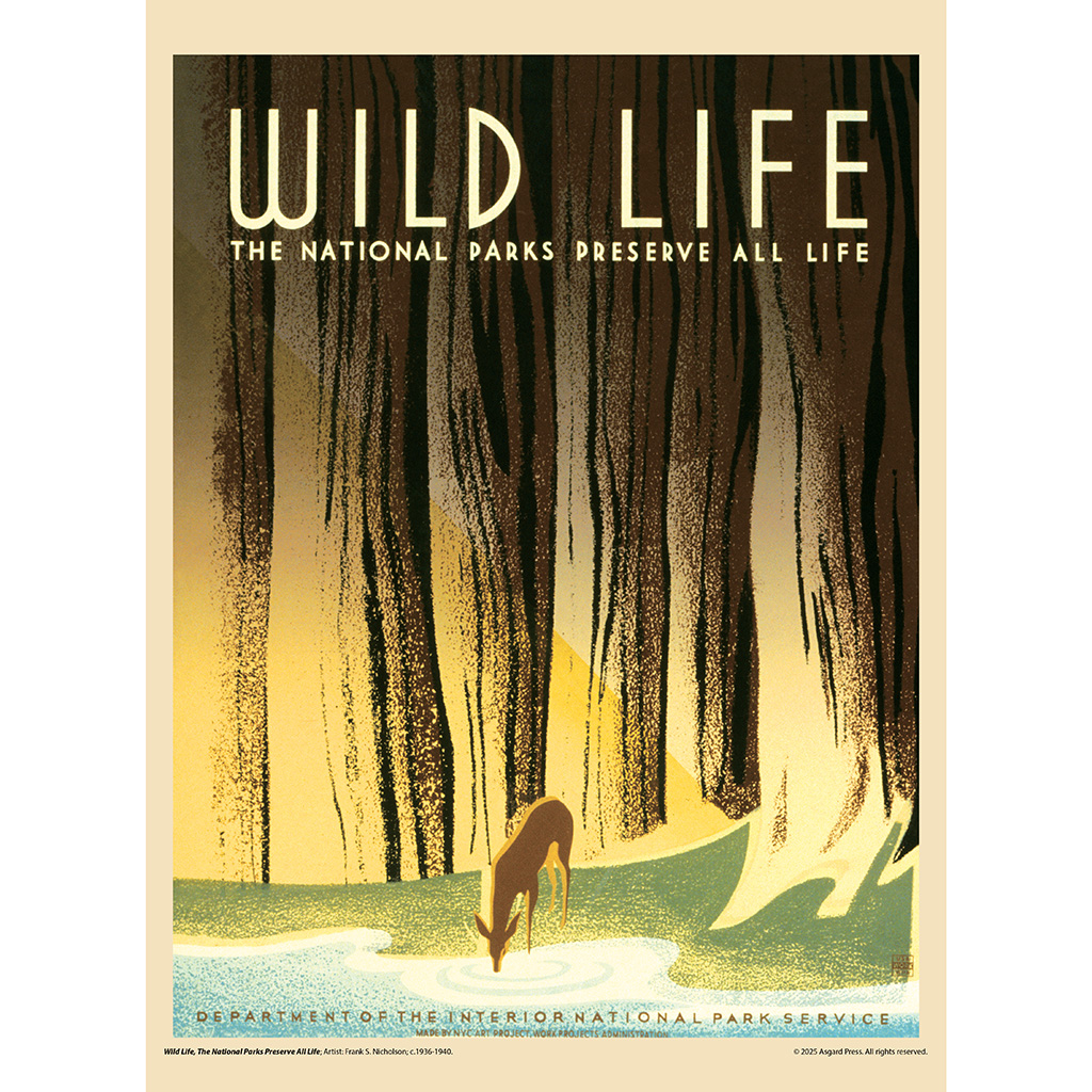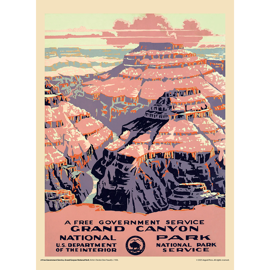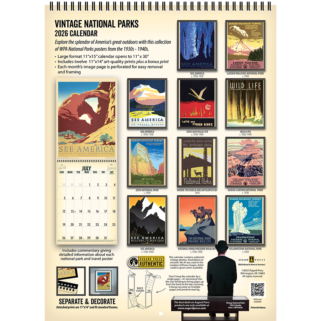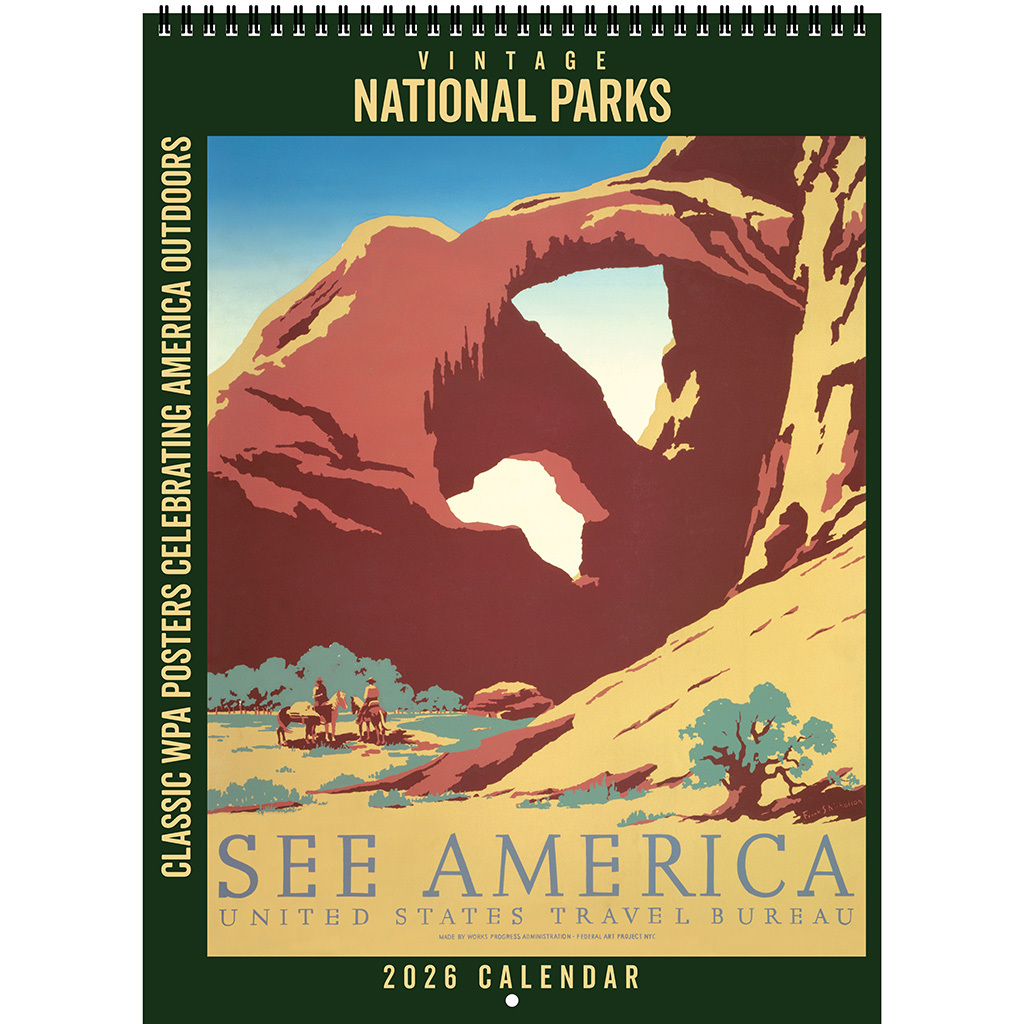 Explore the nostalgic splendor of America’s great outdoors each month with the Asgard Press 2026 Vintage National Parks Deluxe Wall Calendar, a collection of faithfully reproduced vintage American National Park and travel posters from the Works Progress Administration. By showcasing the attractions of national parks, these posters inspired travelers to explore their own country, leading to increased spending on transportation, accommodations, and local businesses. Each month of this calendar features a different vintage National Park poster, accompanied by expanded captioning that tells the story of each image and the Works Progress Administration’s program for poster artists. With its large vertical format of 11×15 inches, our wire-bound deluxe wall calendar opens to an impressive 11×30 inches. The perforated design allows for easy removal of each month’s image, making them a perfect fit for standard 11×14 inch frames. Organize all your important dates with this calendar, while celebrating a big, bold, and optimistic America every month.