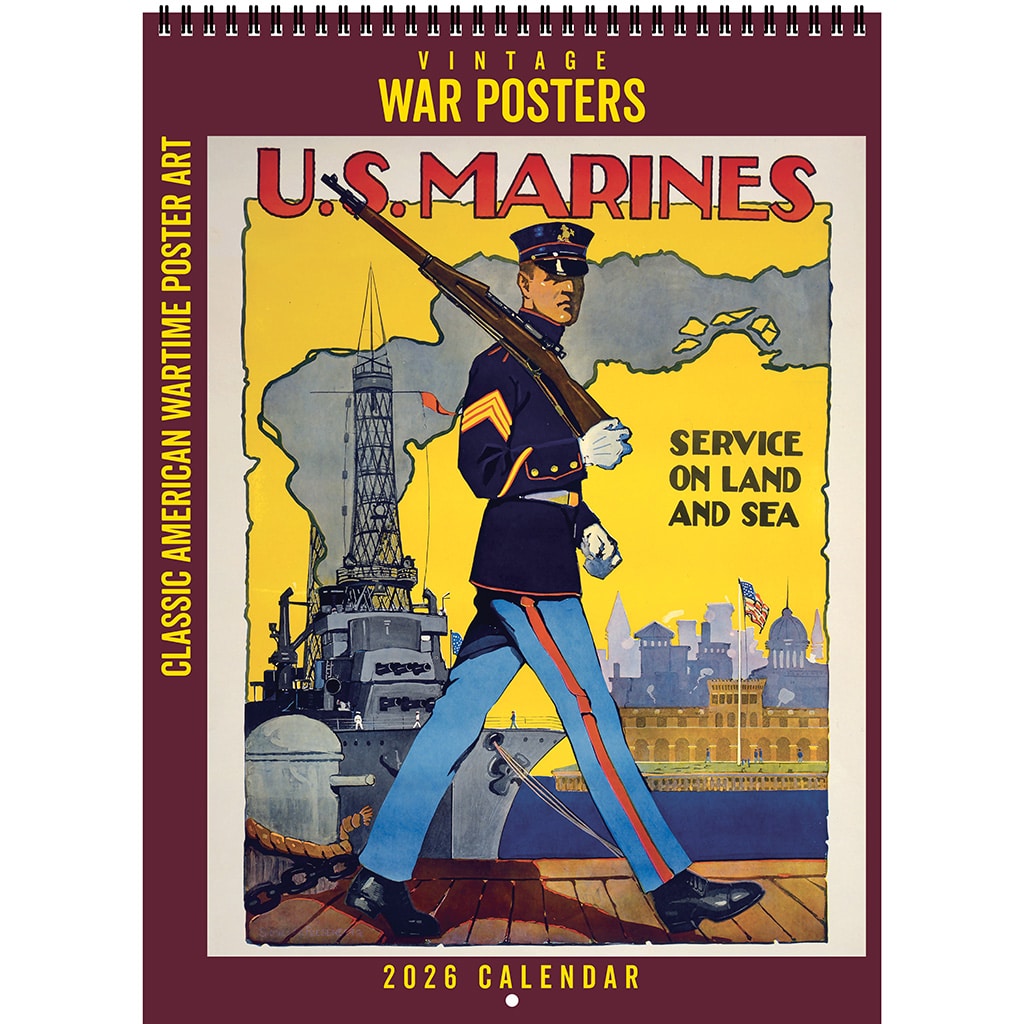Rally the troops to revisit the war effort each month with the Asgard Press 2026 Vintage War Posters Deluxe Wall Calendar, a collection of faithfully reproduced vintage American military posters from World War I and World War II. Posters promoting recruitment, morale, the sale of war bonds and the role of civilians during wartime were common sights in the United States during both World Wars. These posters featured bold imagery, stirring slogans, and patriotic symbols, instilling a sense of duty, unity, and sacrifice among the American population. From encouraging enlistment to promoting rationing and conservation, these posters played a significant role in shaping public perception and mobilizing support for the wars. Each month of this calendar features a different vintage war poster, accompanied by informative captioning that gives context to each image. With its large vertical format of 11×15 inches, our wire-bound deluxe wall calendar opens to an impressive 11×30 inches. The perforated design allows for easy removal of each month’s image, making them a perfect fit for standard 11×14 inch frames. Organize all your important dates with this calendar, while bringing a nostalgic touch from an earlier era to your home or office space.