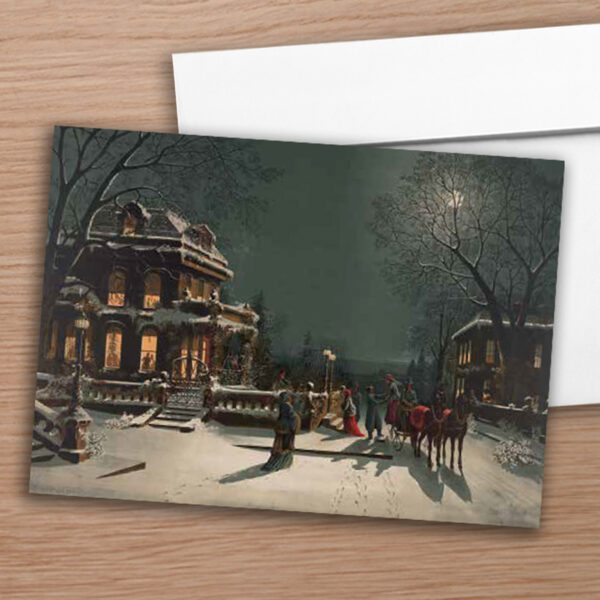 Our seasonal notecard is a reproduction of “Christmas Eve,” a lithograph produced by Joseph Hoover and Co., Philadelphia, Pennsylvania, dated 1880. The artwork portrays a Victorian scene of guests arriving for a party. The warm glow of holiday celebration pours through the windows of the host’s home. This 5″x7″ notecard will be sealed inside a white envelope after your message has been added.